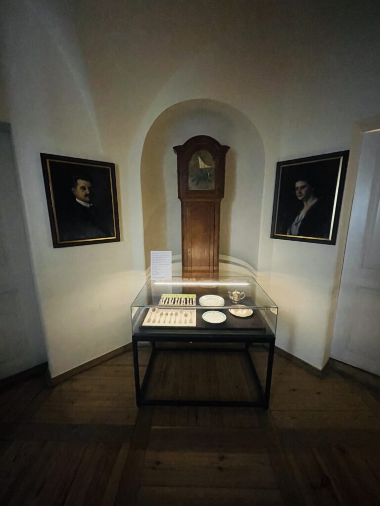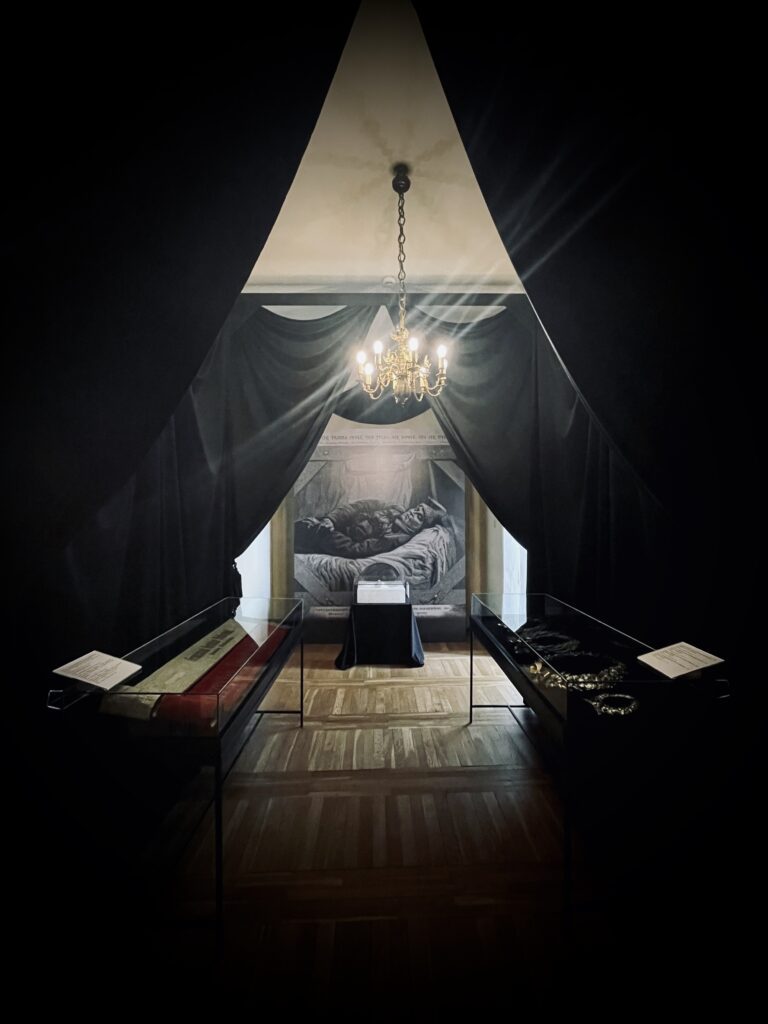 Wchodzimy do mrocznej sali. Mickiewicz utrwalony w rzeźbie spogląda w niej na  panoramę Stambułu. W drugim końcu sali wieszcz na łożu śmierci i jego maska pośmiertna. W gablotach srebrne wieńce i szarfy z wieńców z pogrzebu w 1890 roku. Jedna… wysłana ze Śmiełowa.