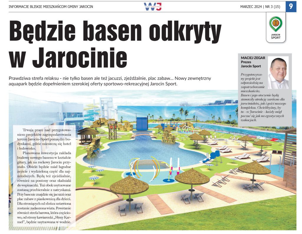 – czytamy w odpowiedzi na interpelację radnego. „Natomiast spółka Jarocin Sport zapłaciła firmie PRmotion 5.658 zł za świadczenie usług promocyjnych w marcu 2024 roku. Na wykazie usług, dołączonych do faktury jest m. in. „Kompleksowe przygotowanie materiału prasowego do miesięcznika „Wieści Jarocińskie” (…) – „Będzie basen odkryty w Jarocinie”. Oznacza to, że spółka zapłaciła firmie PRmotion za promocję rzekomej koncepcji basenu odkrytego w formie gitary, której opracowania nigdy nie zlecała i której oficjalnie nie posiada” – to ciąg dalszy odpowiedzi na interpelację.